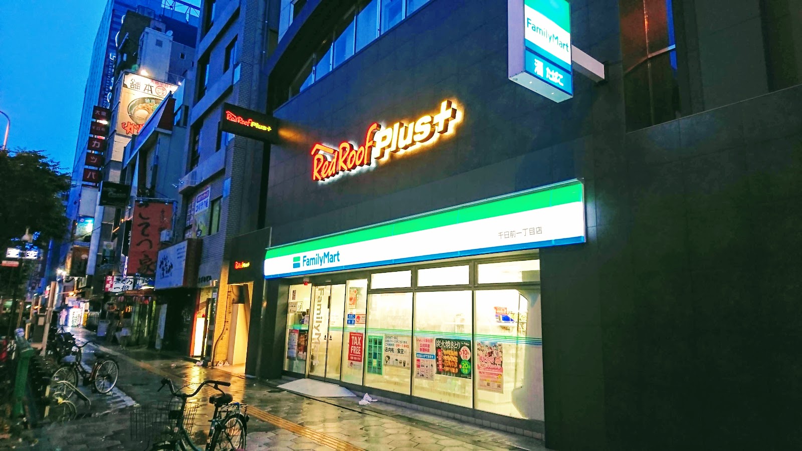 Red roof plus 一樓是日本全家便利商店,出入口在便利商店左側 (無法從便利商店內進出旅館),穿過長通道,便是寬敞的櫃台大廳,大廳陳設一些旅遊資訊與外幣兌換機等,櫃台旁側提供飲料任人取用。櫃台後側是餐廳,我們這次住宿沒附早餐,但臨時想來餐廳用早餐,每人需另付1600日円。